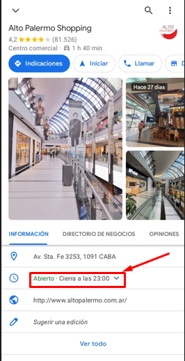 Lo mencionado en el paso 4 es solamente información previa, pero lo que tenemos que hacer en esta instancia es scrolear hacia abajo en la pantalla, donde podemos obtener otro tipo de datos como por ejemplo la dirección exacta, el sitio web y más. Pero justo allí podemos visualizar el reloj con el detalle de si está abierto o no y el horario en el que cierra/abre, al igual que se podía ver en la parte de arriba. Allí es donde debemos presionar para abrir el desplegable y ver más información acerca de los horarios. Si quedan dudas, en la siguiente captura se puede ver claramente dónde hay que tocar.