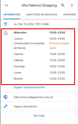 Luego de haber finalizado el paso 5 tenemos toda la información disponible. Es que cuando abrimos ese desplegable se nos muestra toda la información acerca de los días en los que abre ese negocio, y los horarios disponibles día por día. De esta manera habremos finalizado con el proceso y tendremos rápidamente el detalle de cuándo abren y cuándo cierran los negocios que busquemos en cada día.