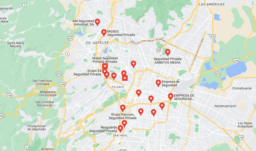 Al dar clic a la lupa o pulsar la tecla enter, de haber resultados disponibles en esa zona y para el termino que hayamos ejecutado la búsqueda, veremos como en la captura superior un mapa interactivo que marca con color rojo cada empresa vinculada. Es posible acercar y alejar así como dar clic si ya hay uno de los ‘items rojos’ que llama nuestra atención para ver el nombre en el que queremos indagar más.