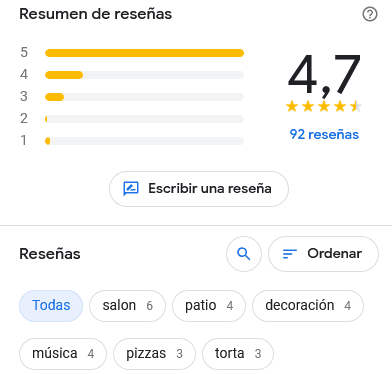 Finalmente, en el apartado de las reseñas, puedes ordenar y ver las mismas con respecto a la palabra clave que contenga la misma. En estas puedes encontrar palabras como: “salón”, “buena música”, “Gestión rápida y en línea”, “buena comida” y mucho más.