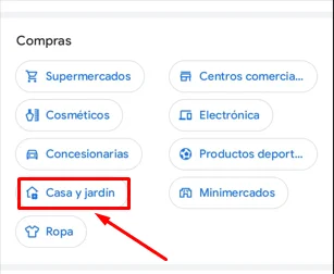 Una vez que ingresamos al filtro de la sección Compras, se nos presentan diversos tipos de negocios a los que cualquier persona puede acudir para comprar cierto producto. En esta instancia tampoco encontramos directamente la opción de Ferreterías, y esto se debe a que la aplicación no la toma en cuenta como una categoría en sí misma. Sin embargo, sí podemos ver la alternativa de Casa y jardín, que engloba a las ferreterías ya que este es el rubro al que se abocan este tipo de negocios (aunque es muy probable que en este filtro también encontremos otro tipo de locales destinados a la comercialización de productos para la casa, como por ejemplo mueblerías).