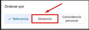 Otro filtro que viene aplicado por defecto en los resultados que aparecen es el de la Relevancia, es decir, que aparecen primero aquellos comercios que tienen más importancia dentro de Google, y esto se mide por varios factores como por ejemplo la calificación del servicio, la cantidad de visitas, de búsquedas, entre otras. Si queremos que primero aparezcan los que estén cerca de nuestra ubicación tenemos que cambiar esa configuración, y para hacerlo primero debemos tocar en el botón que dice Relevancia, ubicado en el extremo superior izquierdo de la pantalla.