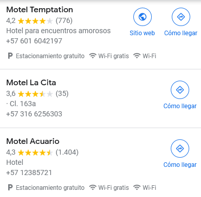 Igualmente, vas a poder ver qué tipos de servicios ofrecen, ya sea: Wi-Fi, estacionamiento gratuito, restaurante, piscina, entre otros. Ten en cuenta que esta información va a variar de acuerdo a cada motel.