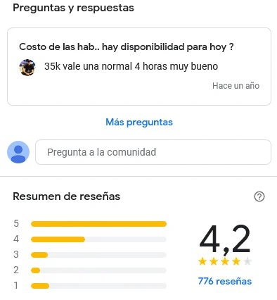Por último, uno de los pasos más importantes para elegir la mejor opción de moteles cerca de tu ubicación, es analizar las reseñas de los huéspedes. Estas las puedes visualizar en la pestaña de “reseñas” ubicada en la ficha de información.