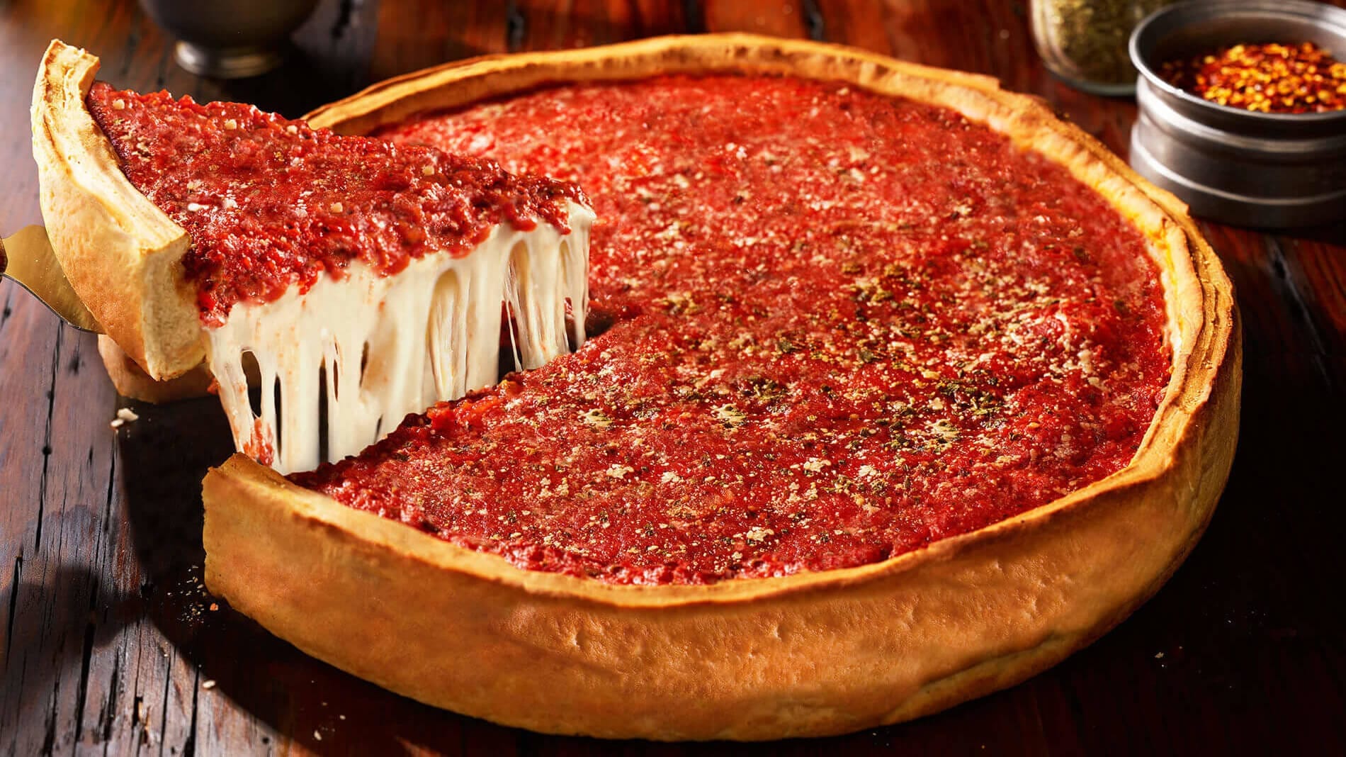 La pizza estilo Chicago, también reconocida mundialmente como «deep-dish pizza» es una de las variantes más icónicas de este menú. Este estilo de pizza resalta su masa gruesa y alta, que conforma un borde notorio, lo que permite que se cocinen grandes capas de ingredientes dentro suyo. Su origen se traslada a los años 40 en Chicago, una ciudad que funcionó como punto de encuentro para los inmigrantes italianos que traían desde Europa sus tradiciones gastronómicas.