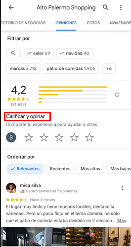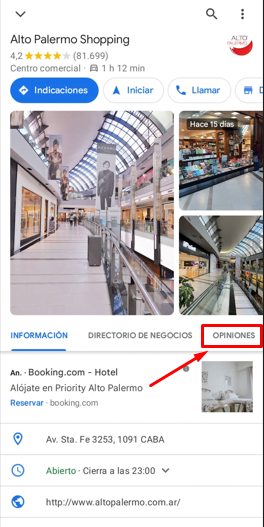 Luego de haber visto el resumen (aunque no es obligatorio) podemos acceder directamente a la sección que tiene todos los comentarios que los usuarios fueron dejando con el correr del tiempo. Abajo de las fotos del lugar hay una barra que tiene distintas opciones de secciones como por ejemplo información, directorio de negocios, fotos, entre otras. Allí está la opción de Opiniones, y debemos presionarla para pasar a ver todos los comentarios, reseñas y calificaciones.