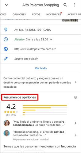 Antes de entrar a la sección de opiniones completa contamos con una opción previa, que es la de obtener un resumen de las reseñas que la gente fue colocando con el tiempo. Luego de haber seleccionado el sitio al que queremos ir se nos proporcionan todos los detalles de la dirección, los horarios de apertura, la descripción, y justo debajo de eso podemos ver una sección que dice Resumen de opiniones. Allí está el promedio de calificación que le pusieron, como así también algunos comentarios que la gente ha ido dejando. La principal diferencia con la sección de opiniones completa es que no se muestra todo, sino solamente los comentarios más relevantes.