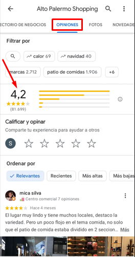 Algo importante para mencionar es que por defecto las primeras opiniones que aparecen son las más relevantes, pero tenemos la posibilidad de ordenarlas por otras variables como por ejemplo las más recientes, las que calificación más alta, de calificación más baja, entre algunas otras.